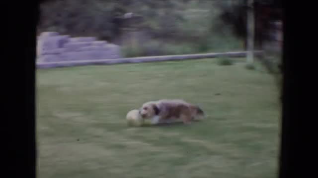 > 1961: a small dog playing with a ball in a grass courtyard TOLEDO, OHIO