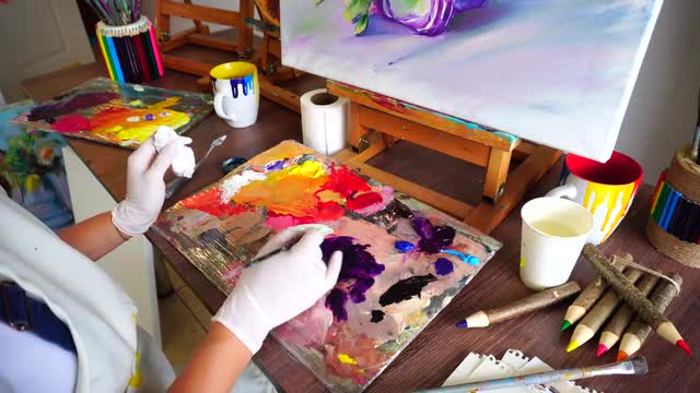 Artist paints a picture of oil paint brush in hand with palette