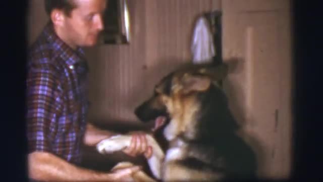 > 1968: a young man playing with a german shepherd dog in an enclosed space COTTONWOOD, ARIZONA