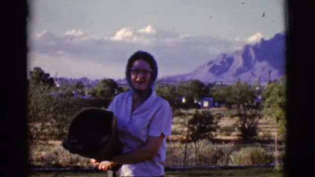 > 1968: old woman holds a bundle while standing in front of a mountain and speaking to someone COTTONW