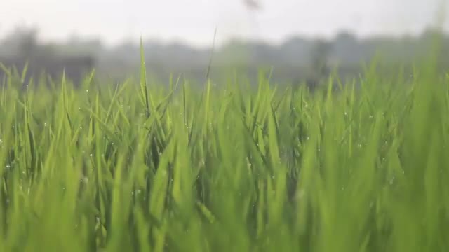 Green Rice Sprouts in the Dew, Rice Sprouts Fluttering in the Wind, Rice Sprouts in the Glare of the Sun, Sunny Weather, Out of Focus