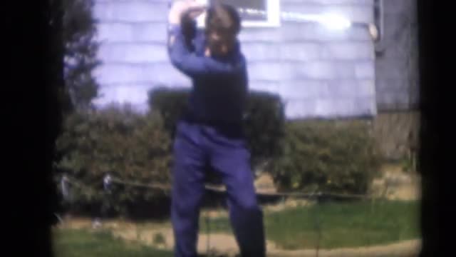1967: young man in blue swings a golf club near a home CAMDEN, NEW JERSEY