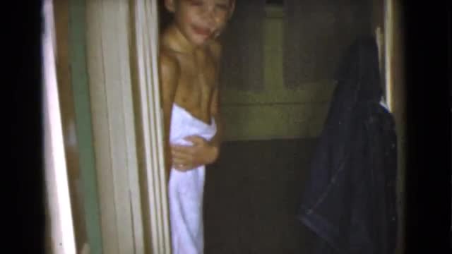 1968: shy boy partially covered in towel hides behind the door COTTONWOOD, ARIZONA