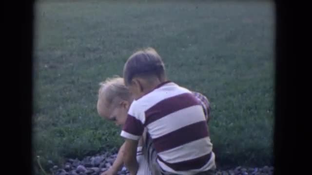 > 1964: two small children playing side by side with rocks in the yard NIAGRA FALLS, NEW YORK