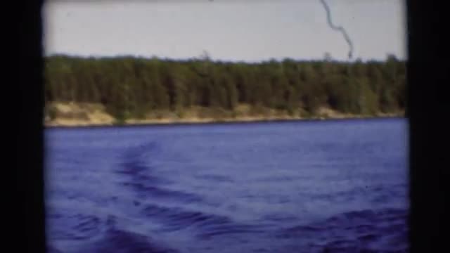 > 1953: a beautiful pine covered shoreline as seen from a moving vessel on the water WISCONSIN