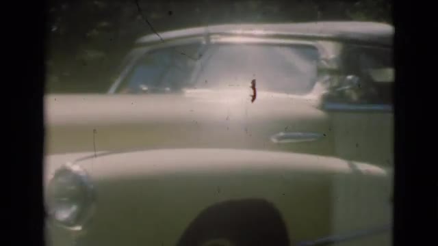 > 1951: a man unloads the trunk of a cream colored classic automobile on a sunny day CANADA
