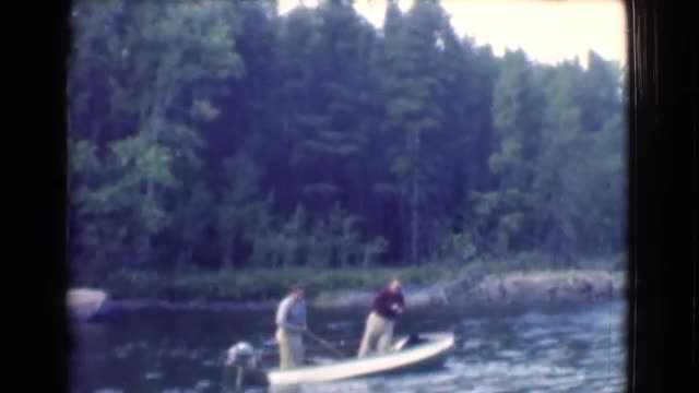> 1951: two men fishing in a small boat in a river in the forest CANADA
