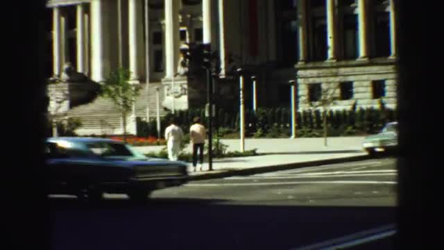 > 1968: two peoples are walking carefully when cross the pedestrians VANCOUVER, CANADA