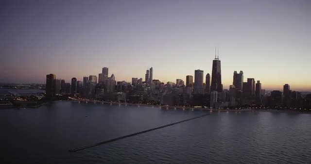631092 - WS POV Skyscraper and towers at bay in dusk