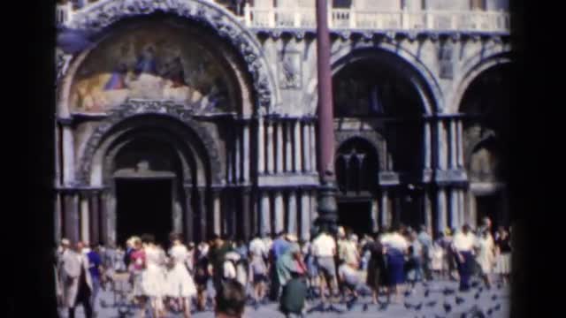 717305 - 1960: tourists feed pigeons in a square in front of a building with paintings over its arches VENICE