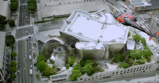 WS POV AERIAL View of Walt Disney Concert Hall / Los Angeles, United States