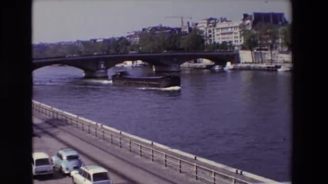 650566 - 1969: bridge with traffic and riverboat PARIS, FRANCE