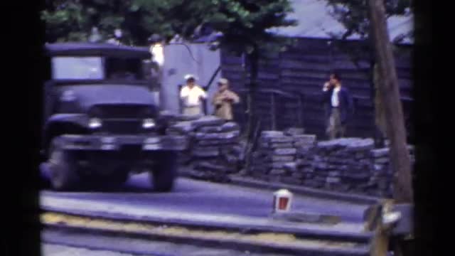 721528 - 1953: military, road, and rail traffic roll down a busy roadway lined with construction debris JAPAN
