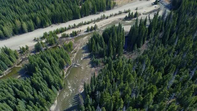 1129655 - Aerial view of winding river adjacent to the green spruce forest and empty road. On a sunny day in C