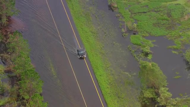 > MS POV AERIAL TS Cars passing through heavy flooded road / United States