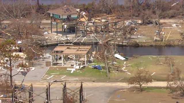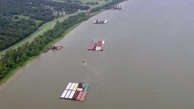 > WS POV AERIAL View of barges in Mississippi river / United States