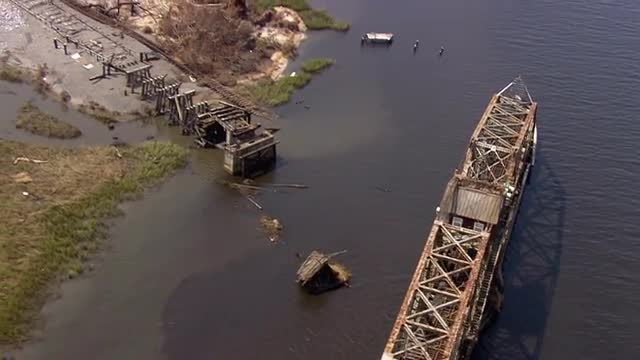 > MS POV AERIAL Bridge destructed due to storm / United States