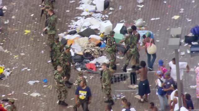 > MS POV AERIAL TS Survivors walking towards refugee camp / United States