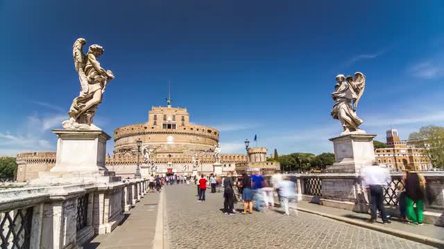 > Long shot timelapse of Saint Angel's Castle and Bridge with people crowd. Rome, Italy. April, 20