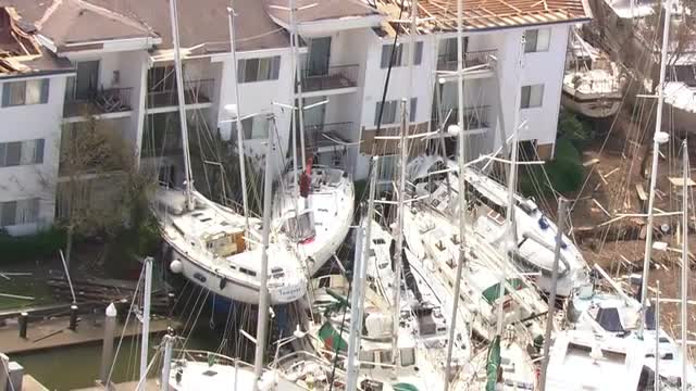 MS POV AERIAL ZO Grand lagoon boats slammed into apartment building / United States