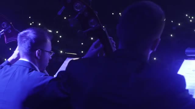 Kiev/ukraine - Feb 14 2015: Greatest Hits by Rock Symphony, Concert in Kiev 02.14.2015. the World Music Hits. Ukrainian Tour. Conductor is Nikolai Lysenko. Viewers Are Standing and Applauding and Walk Away at the End of the Performance, Curtains Are Closing and Light Goes Out, Musicians at the Curtain Call. Women With Bows. Conductor is Standing on a Foreground. Cameraman is Taking Video With Professional Equipment. Light is Turned on in a Concert Hall. Viewers Enjoyed the Concert, Music is Performed by Large Symphony Orchestra, Choir and Rock Band.