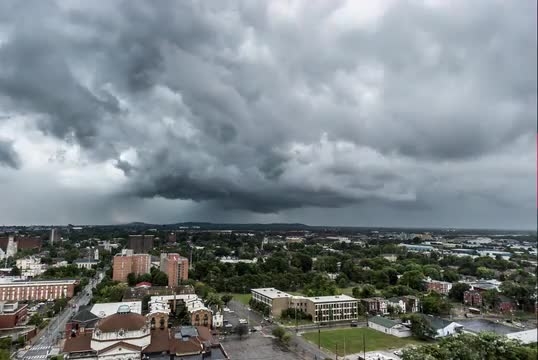 The clouds swirling overhead while a helicopter sits at the take off pad