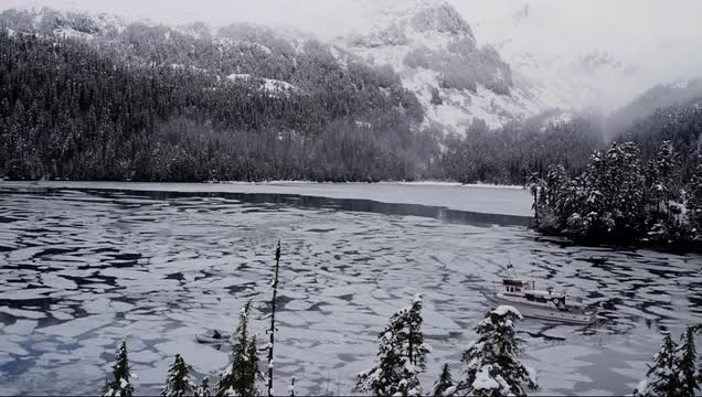 Timelapse of the ice moving around a boat in a harbour in Alaska, storm building in the background