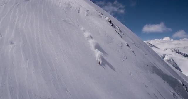 Snowboarder straighlining a steep line in the Swiss Alps, riding on ice. Solitary rider shot from Helicopter
