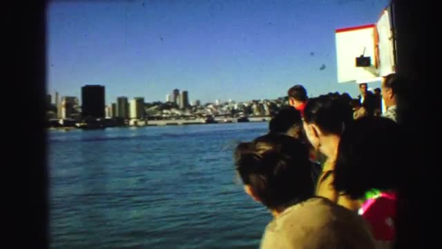 1968: a boat with a crowd of people sailing near a coast full of buildings VANCOUVER, CANADA