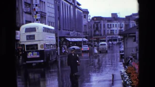 > 1969: a busy, wet city street with traffic and a double-decker bus ENGLAND
