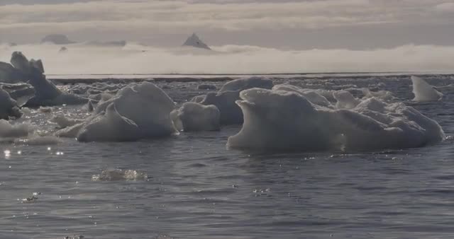 Icebergs floating in the sea, sun shining off the water and ice. Droplets falling from the ice, shot from behing an iceberg.