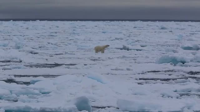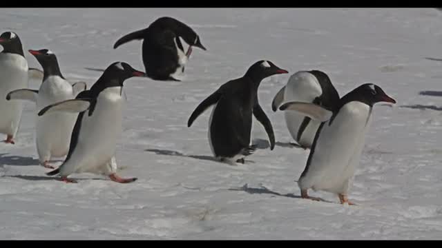 Several penguins walking in the snow together, slow motion. Funny and cute