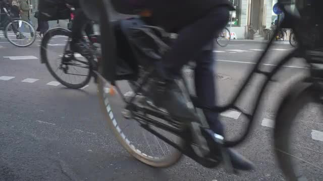 748409 - close up shot of bicycles passing on street in Stockholm