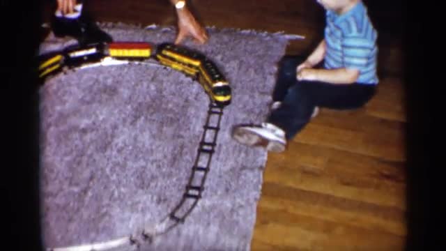 > 1974: two little boys play beside a fast toy train on toy tracks inside a room LYNBROOK, NEW YORK