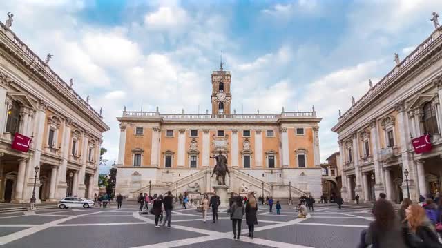 Motion timelapse (time-lapse, time lapse) of ancient Pantheon church with people crowd at the Piazza della Rotonda (city square). Rome, Italy. April, 2016.