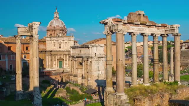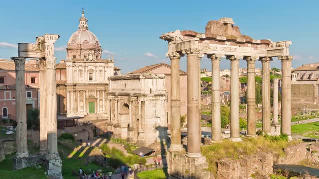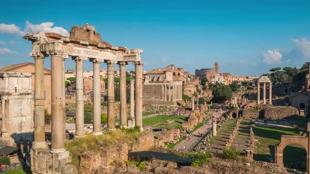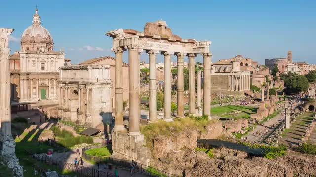 > Roman Forum Timelapse with Temple of Saturn and people crowd at sunny day. Rome, Italy. April, 2016.
