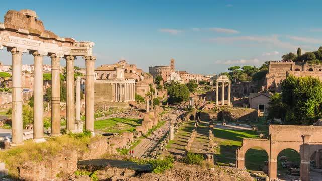Roman Forum Timelapse (time-lapse, time lapse) with Temple of Saturn and people crowd at sunny day. Rome, Italy. April, 2016.