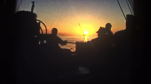 > 1962: men on a boat fishing as the sun sets on the horizon DISNEYLAND, CALIFORNIA