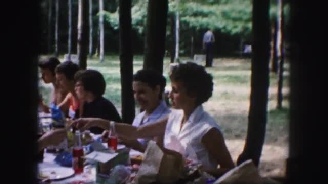 > 1958: woman in white oversees family picnic AMES, IOWA