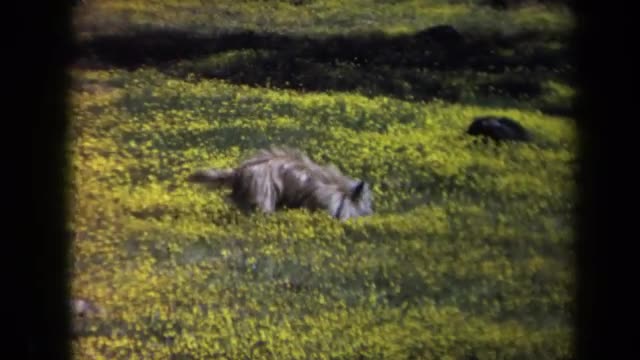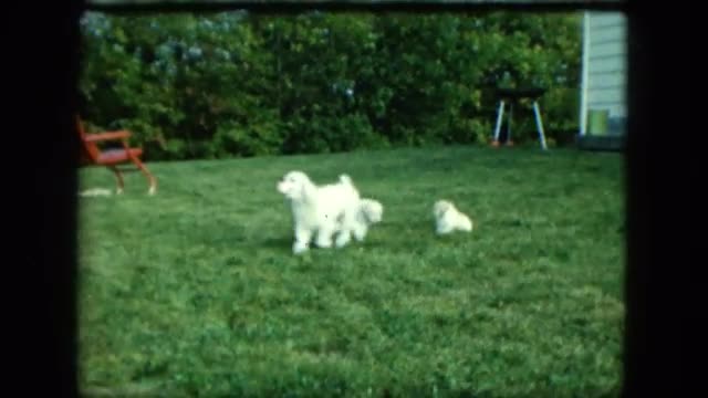 1958: dogs are playing together in the backyard, tangling and having fun with each other. one is bro