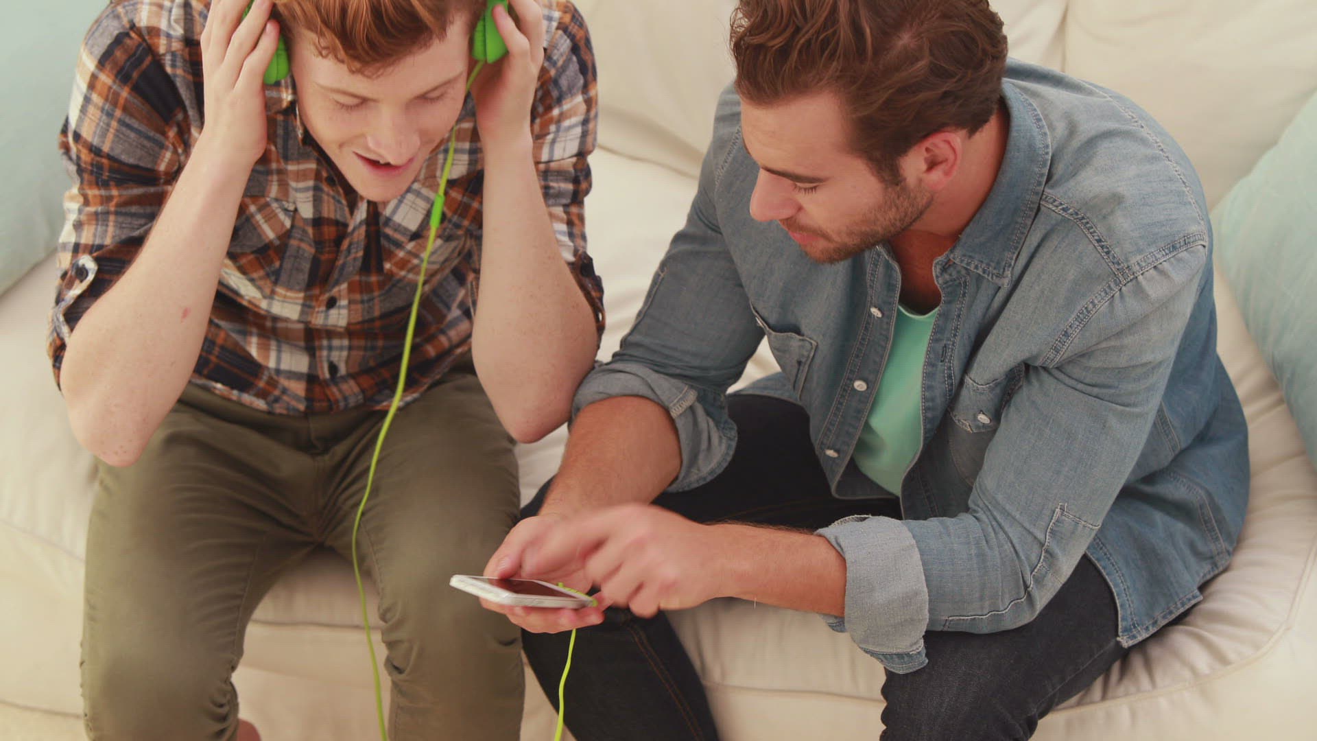 Two Male Friends Sitting in Cafes Guy Using Phone Technology Socialize, Discuss, Watch, Share Secrets, Waiting For the Order, Socialize, Smiling, Satisfied