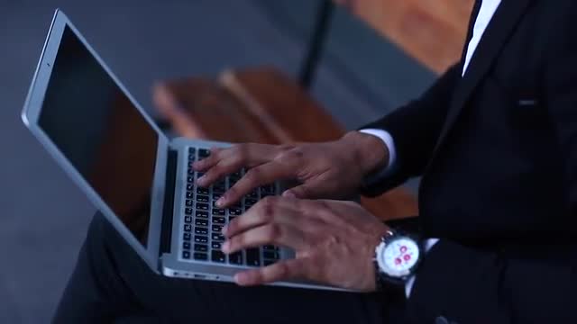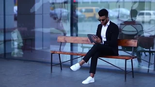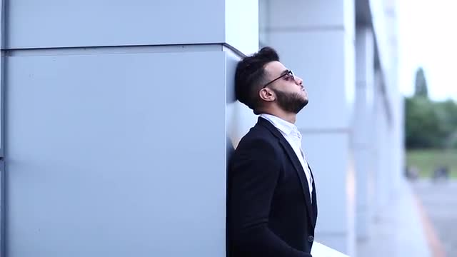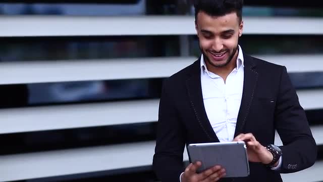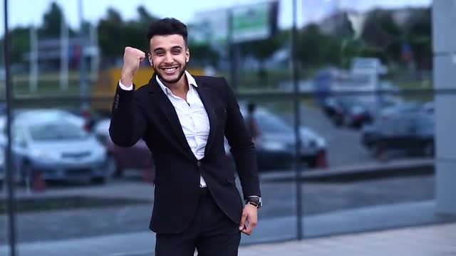 Young Handsome Businessman Arab Muslims is in the Business Center in Black Elegant Dress on Building Background. Businessman Man Male Looking at Time Walking Goes and Smiling.