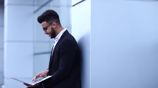 > Arabic Guy in Business Center Stands Smiling Walking Slow