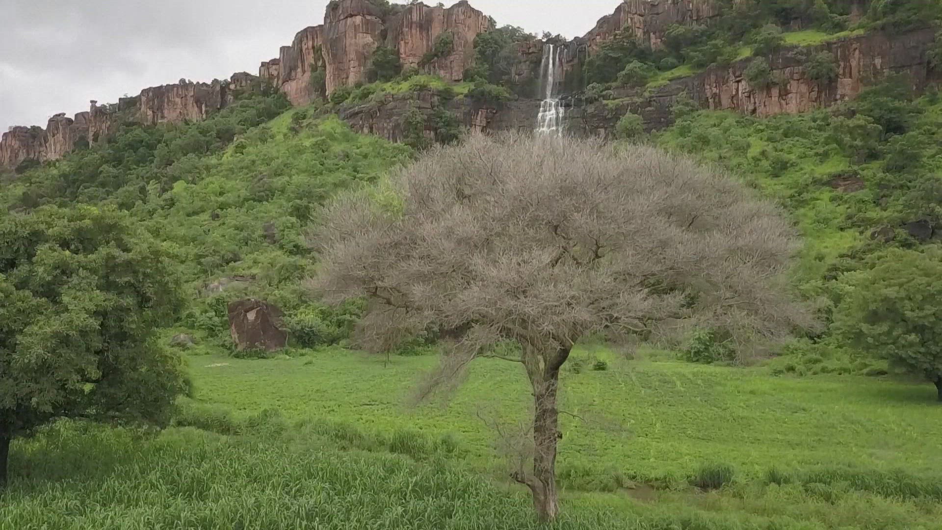 > 1974: magnificent old fort with some visitors standing at the entrance INDIA