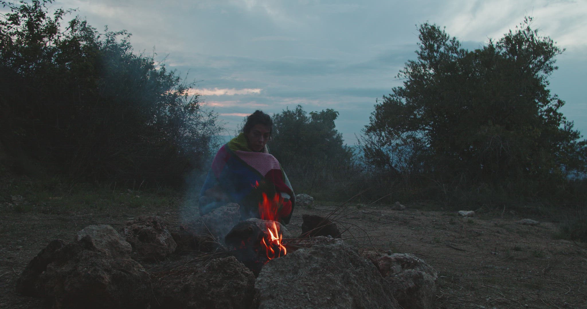 > Lady Sitting in the Park and Talking on Skype Via a Laptop With Headphones