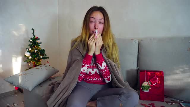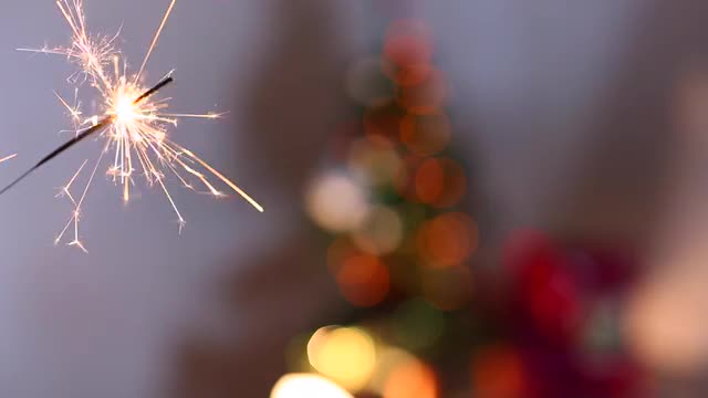 Woman Open Hold Show Gift Present, Lights Bokeh Background From Christmas Tree in Evening.