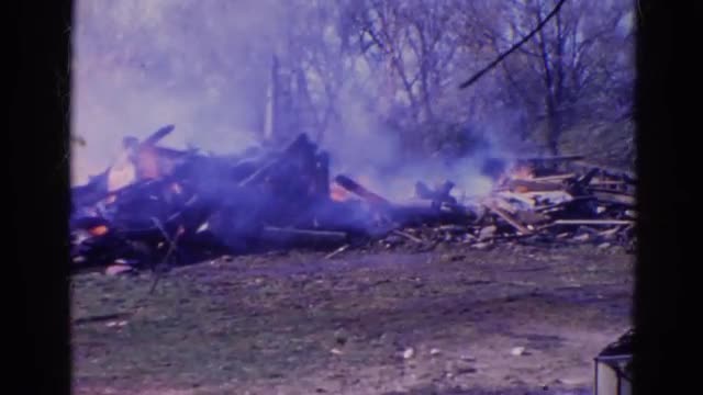 > 1968: a house engulfed in red hot flames and dark smoke as it burns WAUCONDA, ILLINOIS