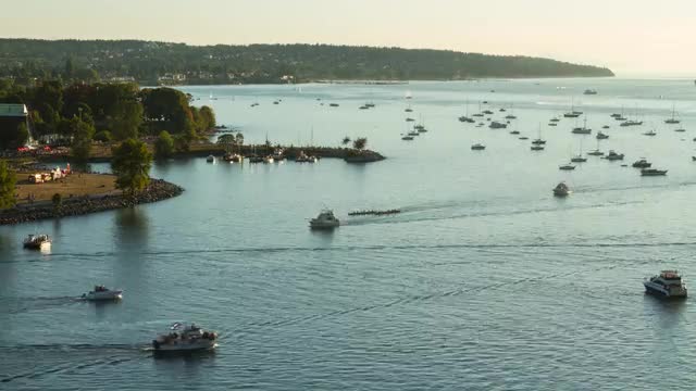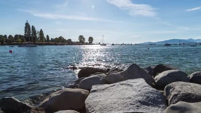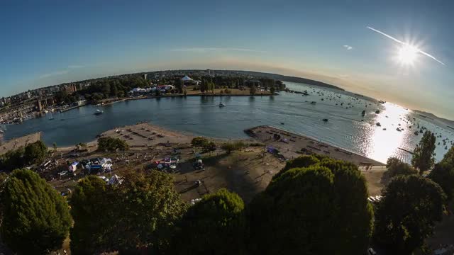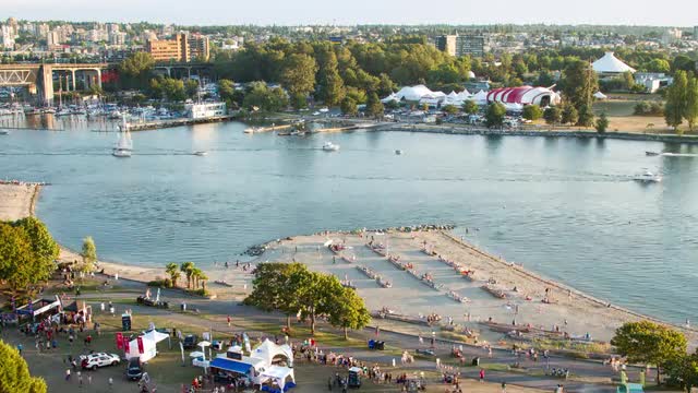 Time lapse of sunset at English Bay in downtown Vancouver with boats in the ocean