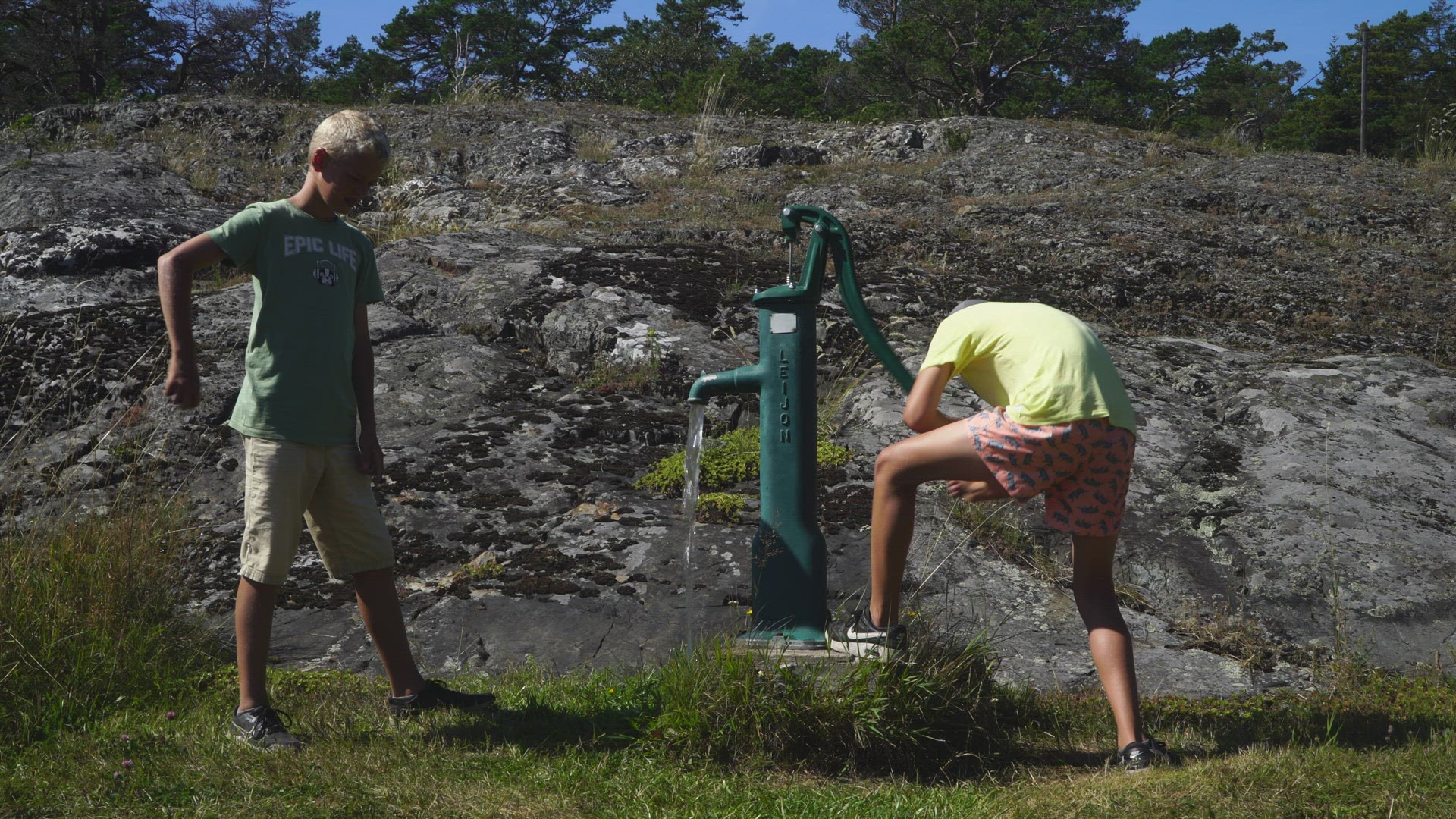 > 1966: two guys outside washing the driveway with a broom CATALINA, CALIFORNIA