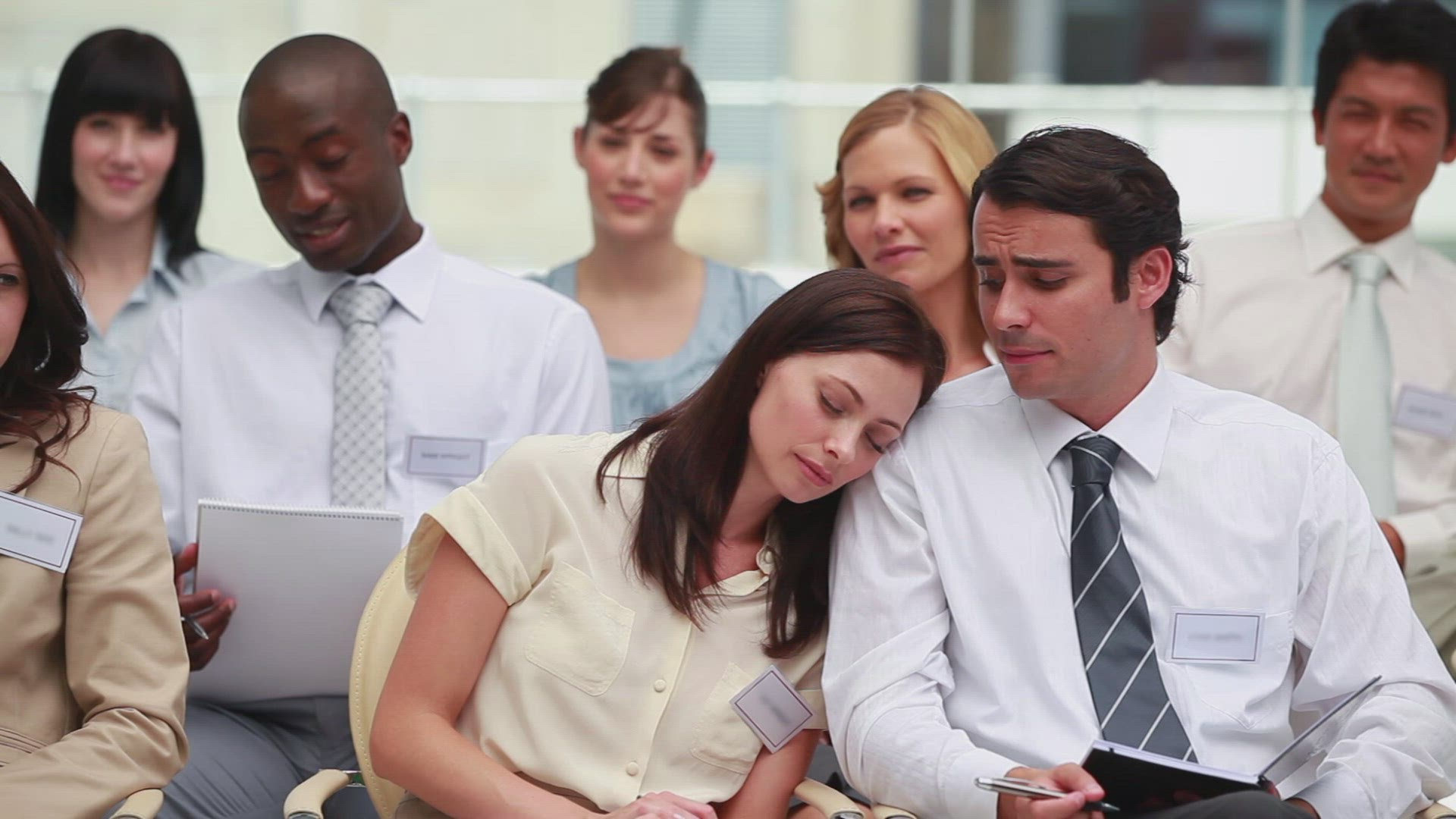 > Young Beautiful Asian Business Woman Female and Caucasian Male Look at Documents Talk on Office Buil